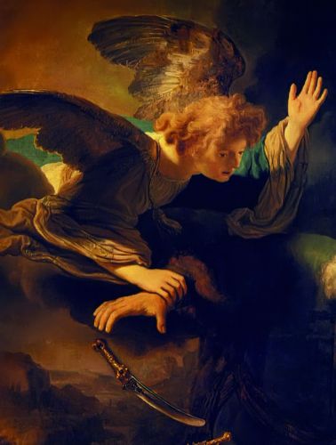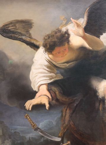 Rembrandt dürfte sich also zunächst mit der Bibelstelle auseinandergesetzt und dann das beschriebene Geschehen bildlich umgesetzt haben: Der Engel des Herrn ruft ihm die erlösenden Worte zu: Tu ihm nichts zu Leide! Du hast die Prüfung bestanden... Abraham sieht ihn überrascht an, ist sich aber seines unerschütterlichen Gehorsams Gott gegenüber bewusst. Er hätte es getan!