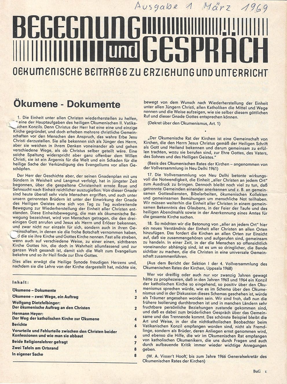 Die erste Ausgabe der "Begegnung und Gespräch" erschien im März 1969.