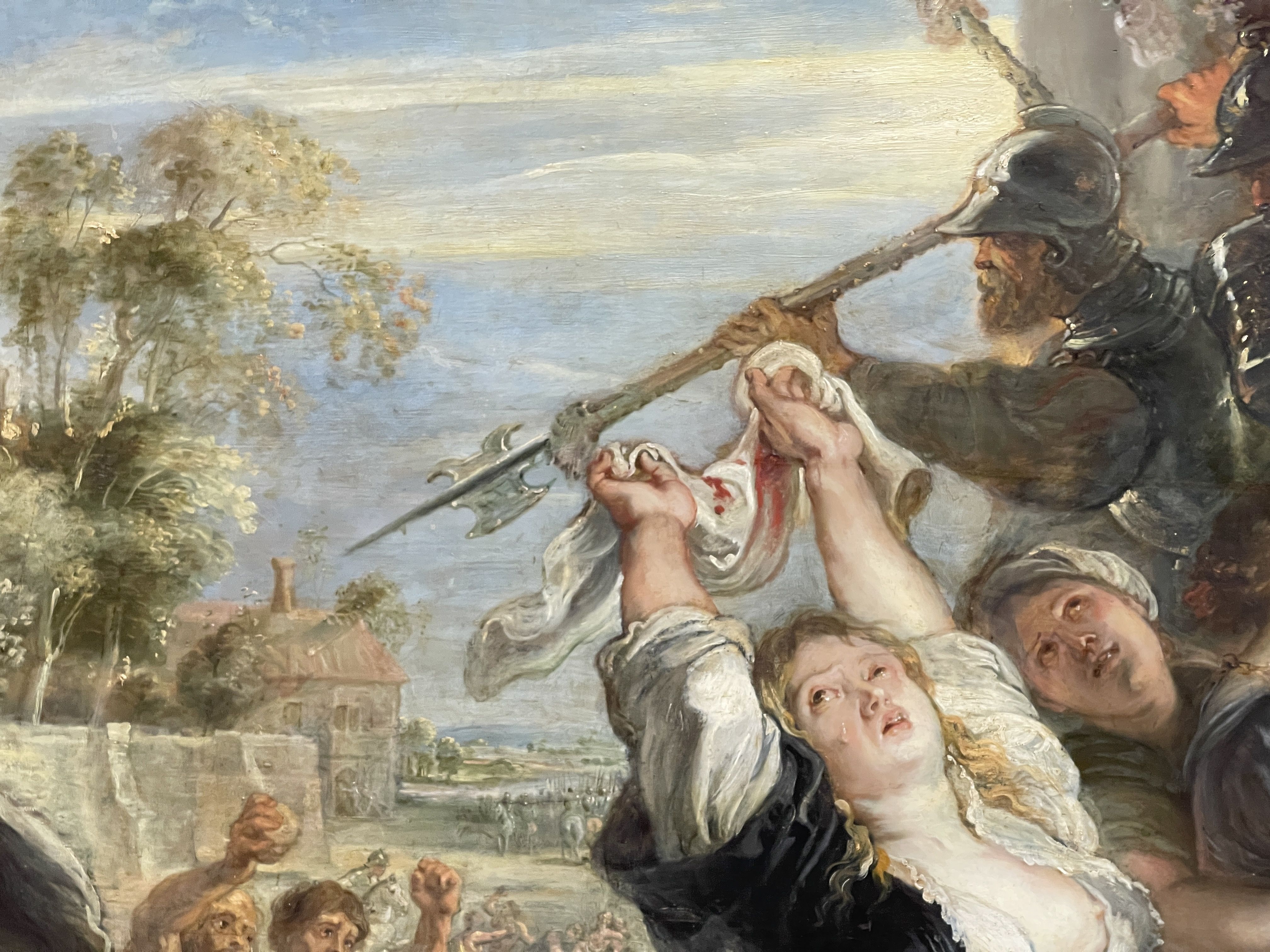 Fast unabhängig von dieser Thematik stellt Rubens mit den drei Engeln links oben eine weitere Frage in den Raum. Die Mutter in der Mitte des Bildes reckt ihre Arme mit einer blutgetränkten Windel in den Händen fragend bis anklagend gen Himmel. Ihr tränenreicher Blick richtet sich auf die Engel, die als Boten Gott repräsentieren. »Macht doch was! Warum lasst ihr das zu?«, scheint sie zu fragen.