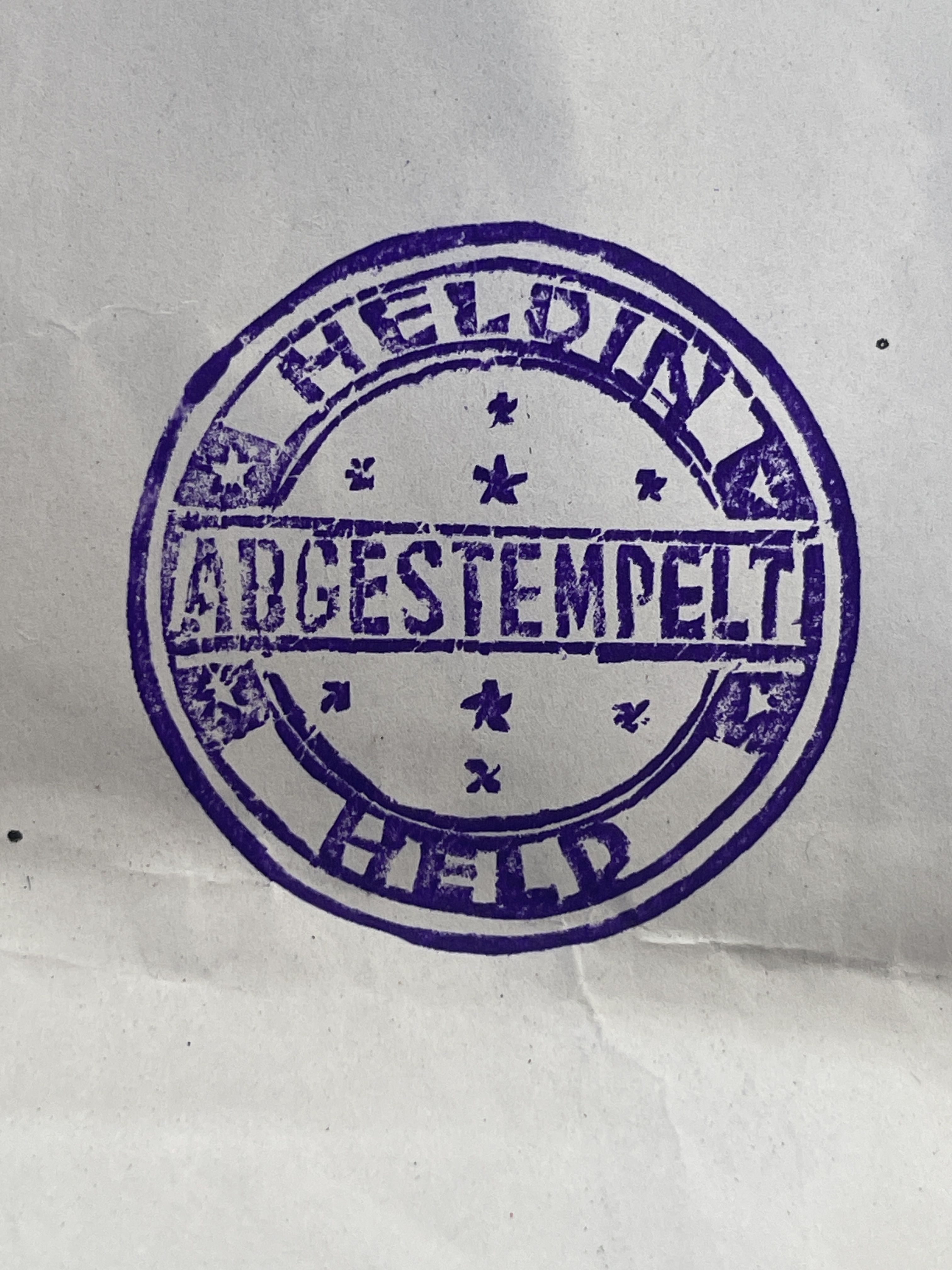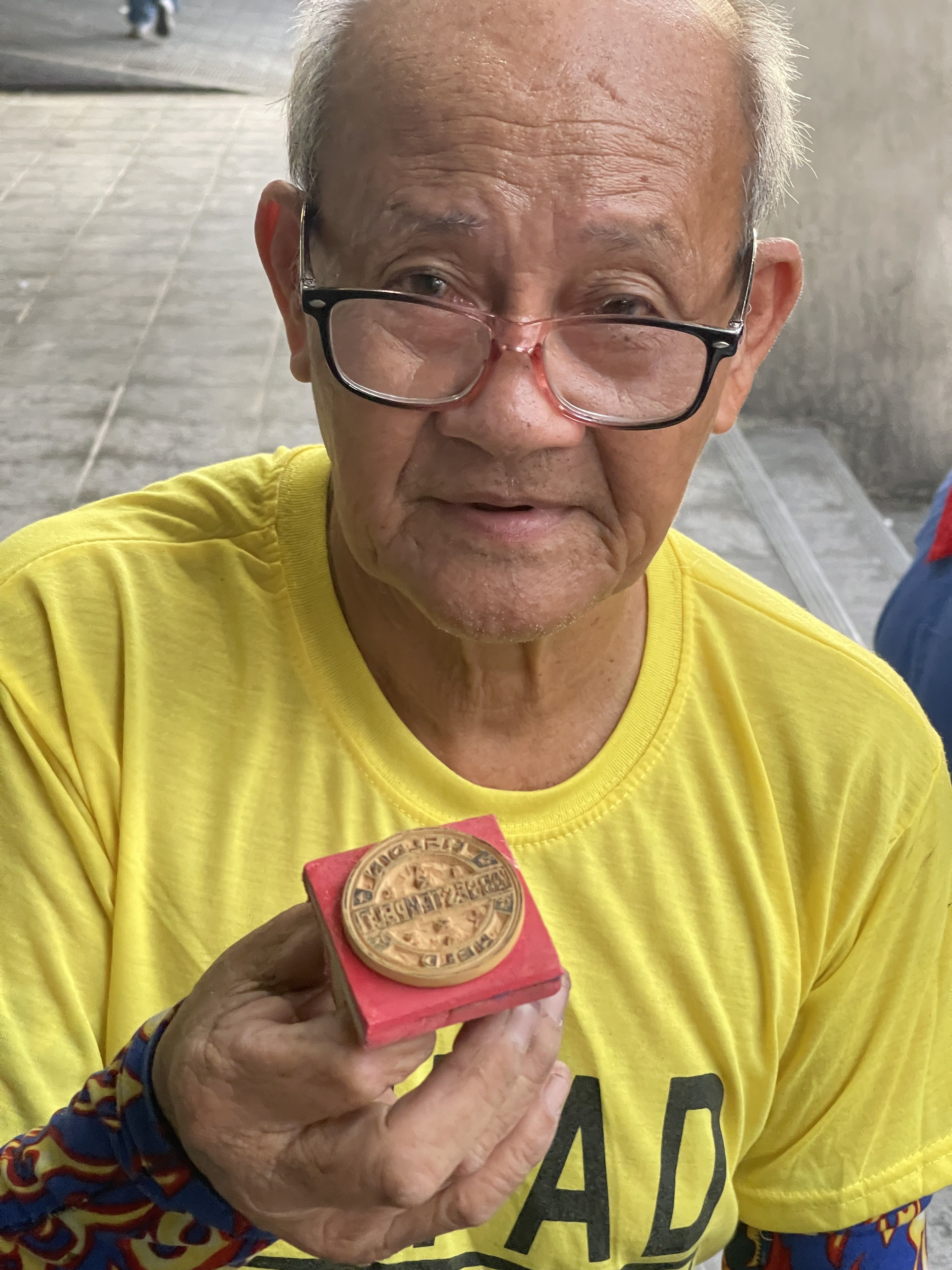 Zurück in die analoge Welt: Der 75-jährige Stempelschneider Mang Erning aus Manila/Philippinen hat den »Abgestempelt«-Stempel für uns geschnitten. Digital konnte er mit der Vorlage nichts anfangen. Er brauchte einen Ausdruck, den er mit Öl tränkte und so die Vorlage auf seine Stempelmatte übertrug. Dann schnitt er der Stempel mit sicherer Hand innerhalb von 40 Minuten. Sein ca. 9-jähriger Enkel – später auch seine Tochter – schauten vorbei um ihn dann endlich zum Essen nach Hause zu holen.