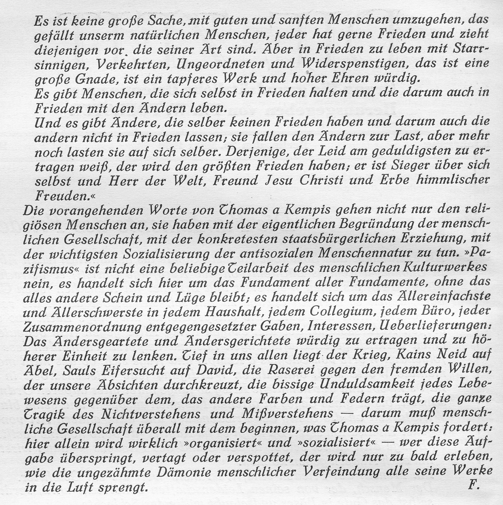 Foerster hat sich als »Traditionalist und Konservativer« verstanden, der durch die Art, wie die deutschen Konservativen und Traditionalisten eine Politik betrieben, die weder den christlichen noch den wirklich deutschen Überlieferungen entsprachen, zu politischen Gemeinsamkeiten mit Links- und pazifistischen Kreisen bewegt worden ist. Diese hätten sich der Bewahrung der von den Christen preisgegebenen christlichen Überlieferungen angenommen oder doch wenigstens eine Ahnung davon in sich getragen, dass das inmitten Europas wohnende Volk eine Mittleraufgabe in Europa zu erfüllen habe und nur auf dieser Grundlage sichergestellt sei und einer ungestörten Entfaltung entgegensehen könne. Stellt sich die Frage: Ist das heute als überholt anzusehen?