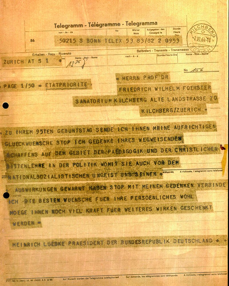 Richtig ist indes, was Bundespräsident Heinrich Lübke am 2. Juni 1964 in einem Telegramm an Foerster gesagt hat: »Zu ihrem 95ten Geburtstag sende ich Ihnen meine aufrichtigen Glückwünsche. Ich gedenke Ihres wegweisenden Schaffens auf dem Gebiet der Pädagogik und der christlichen Sittenlehre in der Politik, womit sie auch vor dem nationalsozialistischen Ungeist und seinen Auswirkungen gewarnt haben.«