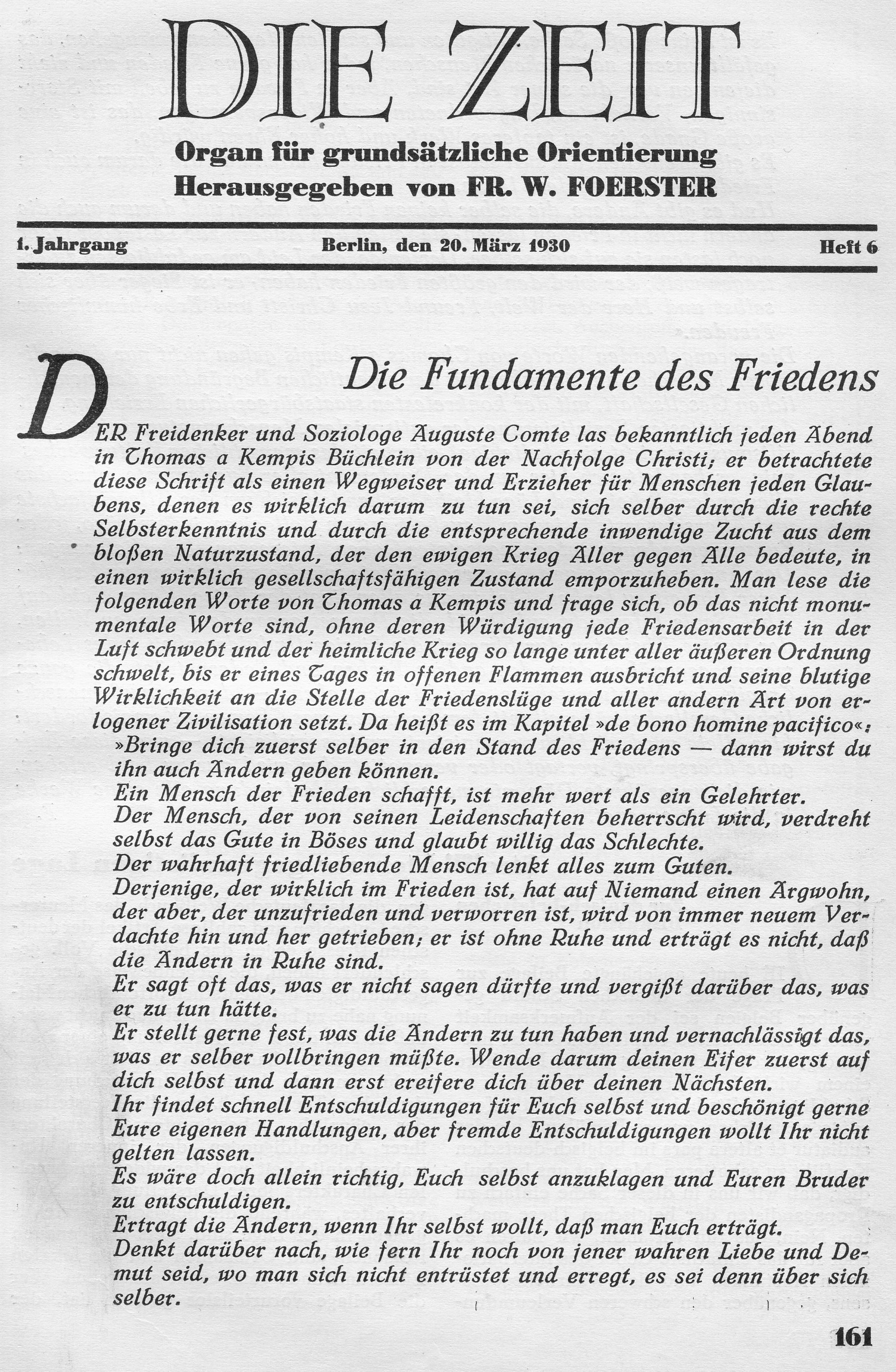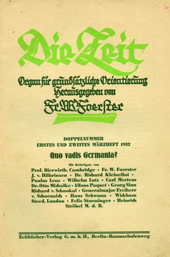 1930-1933 gab Foerster die Halbmonatsschrift »Die Zeit« heraus, die als Mitarbeiter »Geistliche, katholische Laien, Protestanten, Sozialisten vom linksten Flügel ihrer Partei, stockkonservative und leidenschaftlich liberale Autoren – kurz eine wirkliche ‚Volksfront’« (Hans Schwann) vereinigte. Wie Foerster überzeugt, dass Deutschland der »eigentliche Sitz des Kriegswillens in Europa« sei, wandte sich das Blatt gegen die Auffassungen von einer Bedrohung des Weltfriedens durch den Kapitalismus, Imperialismus, Militarismus und die Rüstungsindustrie schlechthin. Wenn Deutschland nicht an der Herstellung Europas arbeite und seine Interessen nicht opferwillig und weitblickend der Einigung Europas einordne, werde es sich und Europa »nur in neue Auflösung stürzen« und den Weg in die Barbarei fortsetzen. Die deutsche Politik, vom Revanchegeist diktiert, werde weiter vom militärischen Denken bestimmt. Die Unterschätzung des fortwirkenden »geistigen Militarismus« preußischer Herkunft durch in- und ausländische Politiker begünstige die Absicht der militaristischen Kreise in Deutschland, die mit dem »Dolchstoß« erklärte Niederlage praktisch in einen Sieg zu verwandeln und die Ergebnisse des Ersten Weltkrieges rückgängig zu machen. Dem Ziel der Wiederherstellung der europäischen Großmachtstellung Deutschlands diene letztlich die Weimarer Republik selbst, da sie die nach 1918 geschaffenen Friedensgrundlagen und Realitäten, insbesondere die Unantastbarkeit der polnischen Westgrenze, nicht anerkenne.
