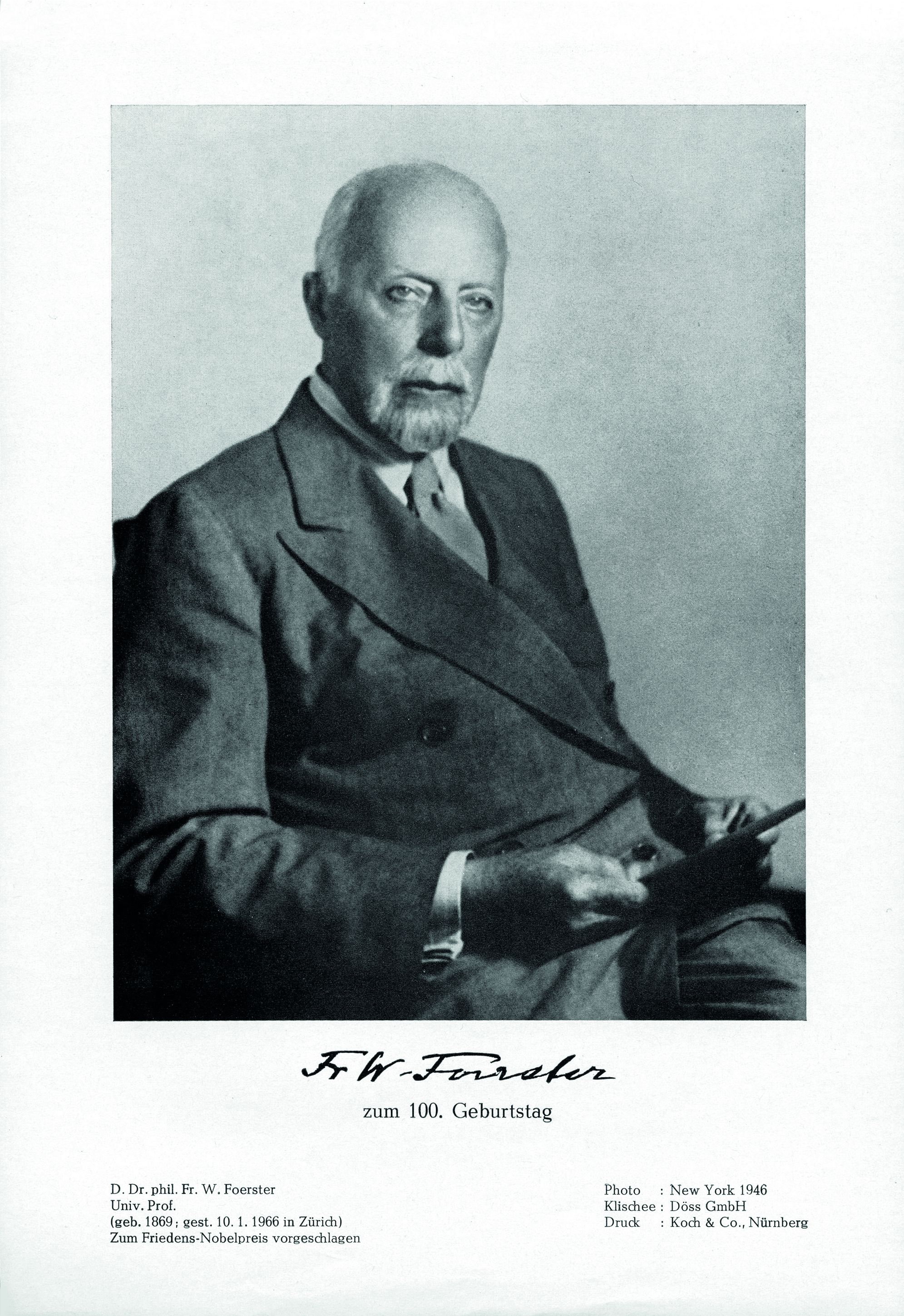 Am 2. Juni 1869 in Berlin als Sohn des Astronomen Wilhelm Foerster, Direktor der heute nach ihm benannten Berliner Sternwarte und 1892 Mitbegründer der Deutschen Friedensgesellschaft, engagierte sich Foerster, der über Kant promoviert hatte, wie sein Vater zunächst in der ethischen Bewegung. Als Wilhelm II. in seiner Sedanrede 1895 die Sozialdemokraten als »vaterlandslose Rotte« beschimpfte, glossierte Foerster die Schmähung in der von ihm herausgegebenen Zeitschrift »Ethische Kultur« und schlug dem Kaiser vor, den Arbeitern doch erst einmal ein Vaterland zu schaffen, bevor er sie verhöhne. Wegen Majestätsbeleidigung zu drei Monaten Festungshaft verurteilt, wich Foerster, durch seine Vorstrafe im Kaiserreich an einer Universitätskarriere gehindert, in die Schweiz aus, wo er in Zürich an der Eidgenössischen Universität durch seine Forschungen und seine vielen Kurse mit Kindern und Jugendlichen die Basis für seine Erfolge als Buchautor legte. Als Ethiker und Pädagoge hat Foerster großen Einfluss auf das geistige Leben in der Zeit vor 1914 ausgeübt. Ebenso herausragend war sein internationales Ansehen.