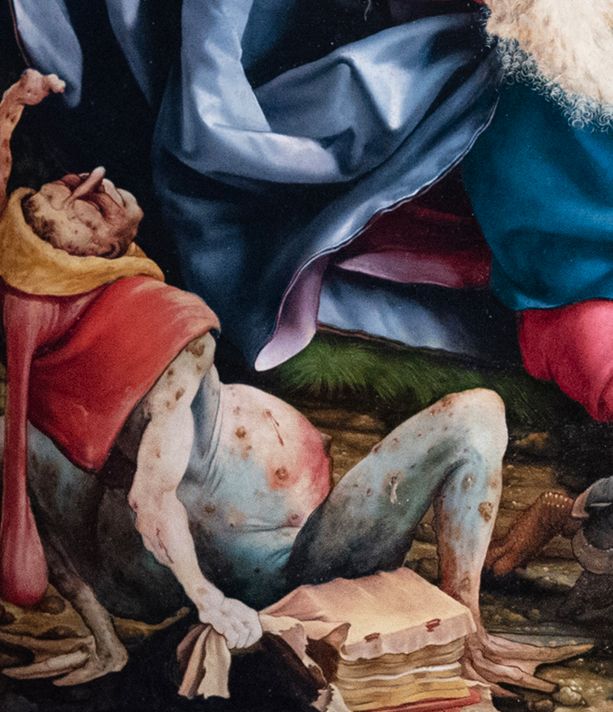 Man könnte auch sagen, das Kreuzigungsgeschehen inkulturiert sich in die Lebenswelt der Menschen des beginnenden 16. Jahrhunderts. Und es ist ja nicht nur dieses eine Detail mit dem an Mutterkornvergiftung leidenden Jesus, der die Krankheit der Menschen vor dem Altarbild spiegelt, auch andere Figuren im Altarensemble tragen diese Symptome.