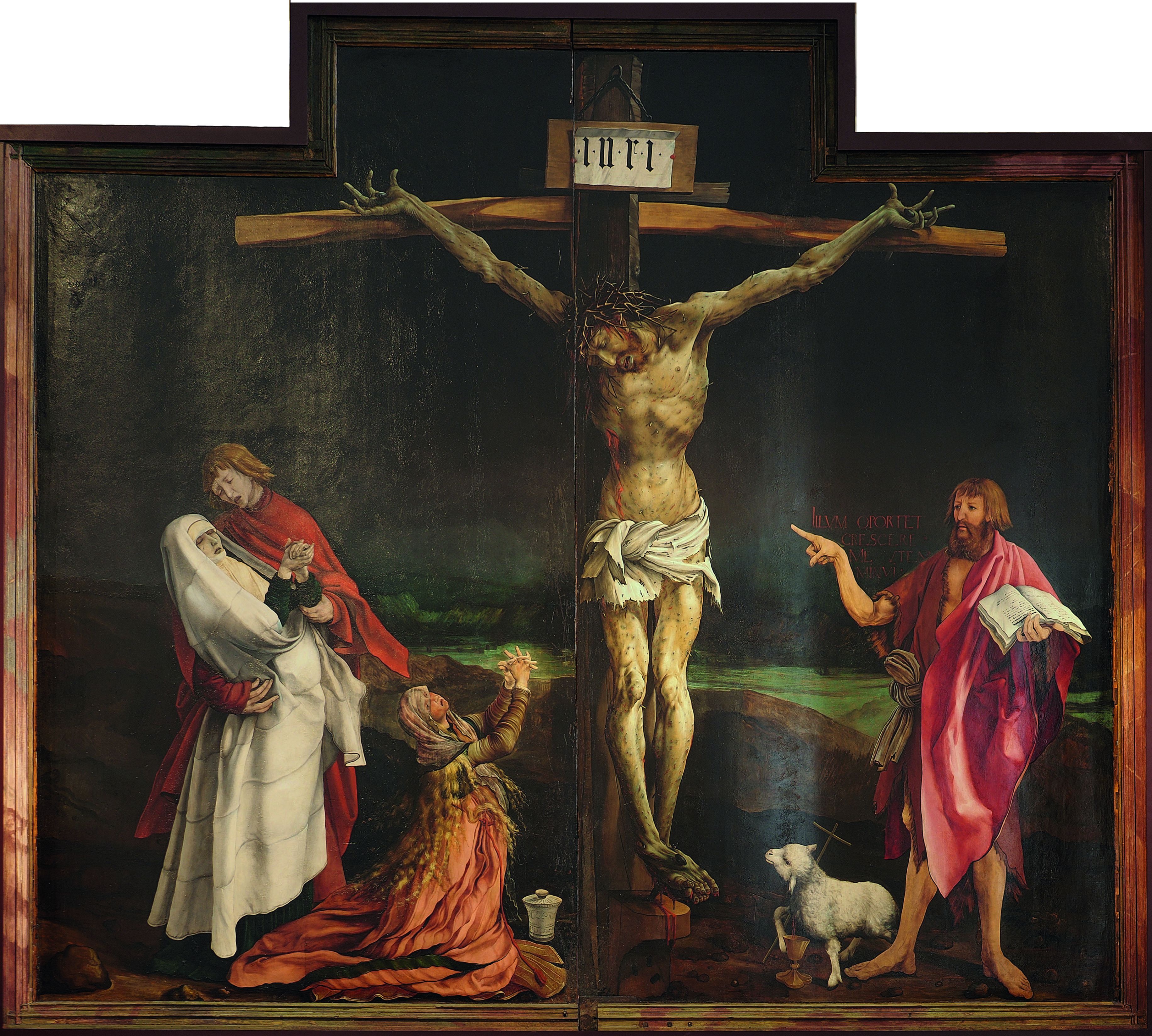 Der Künstler Mathis Grünewald hat sein Werk ja nicht als Bild entworfen, aus dem man sich beliebig Details herausklaubt (also nur den Täufer Johannes oder gar nur den Zeigefinger) oder das man als Illustration von Theologien oder Predigttheorien nutzt, sondern als überaus wirkmächtige künstlerische Totalität in der Kapelle eines Krankenhauses, das auf die Behandlung von Mykotoxikose bzw. Ergotismus (Mutterkornvergiftung – früher das sog. Antoniusfeuer) spezialisiert war.