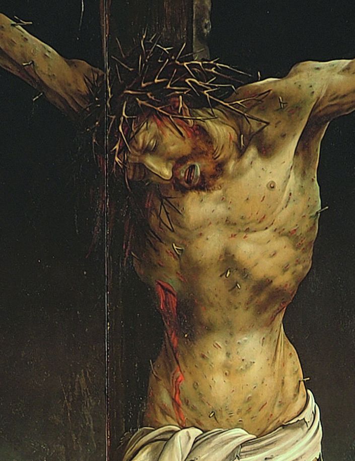 • Die Farben des Körpers, die deutlich vom Inkarnat der anderen Figuren abweichen, entsprechen ebenfalls den zeitgenössischen Krankheitsbeschreibungen. Die zahlreichen kleinen, rot umrandeten Wunden am Körper bluten nicht (außer an der Dornenkrone und an den Beinen); sie deuten das Gefühl des inneren Brands dieser Krankheit an, das als ‚Heiliges Feuer‘ (‚Antoniusfeuer‘) empfunden wird.